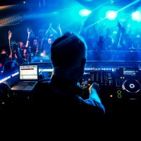 the silhouette of a man operating multiple pieces of audio equipment, including a mixer and speakers. The lights are on, with