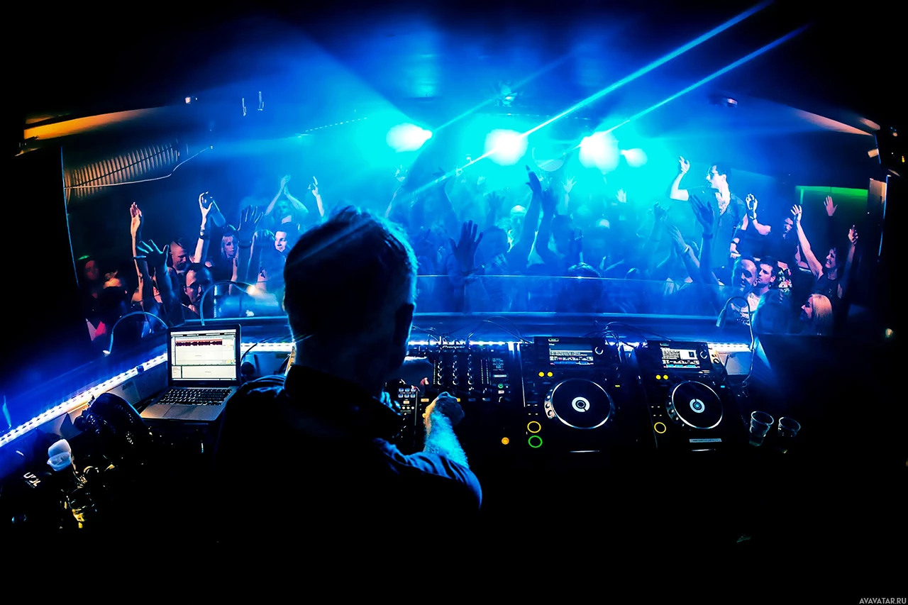 blue hues illuminating the scene, and there appears to be a crowd in the background, suggesting an energetic atmosphere. The setting looks like it could be a nightclub or