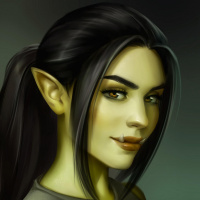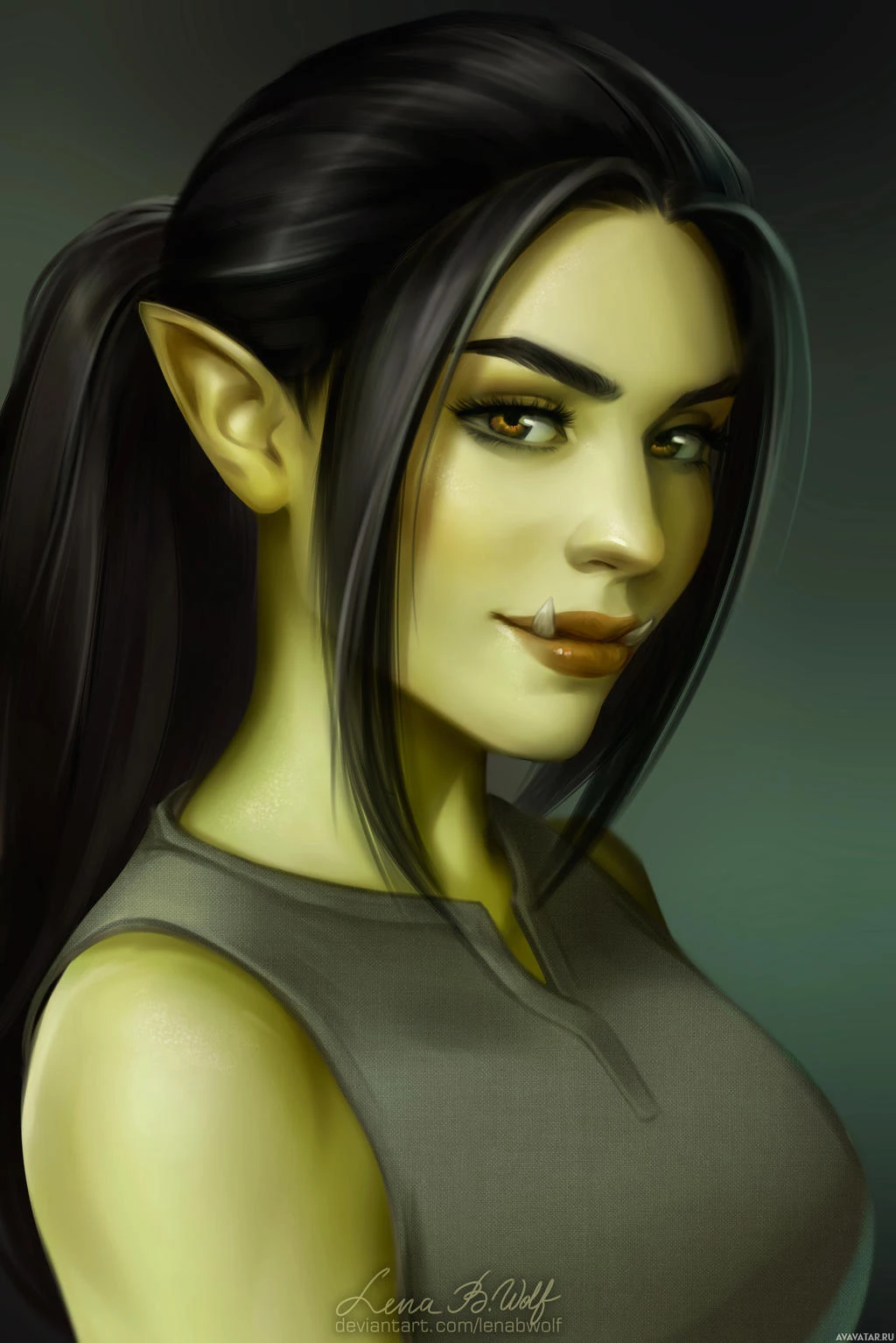 This image depicts a female character with fantasy-like features. She has pointed ears and a smirking expression, which might suggest she is an orc from the fantasy genre, often found in games like World of Warcraft or similar settings. The art style appears to be digital painting with attention to detail and texture.