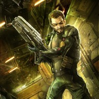 tactical gear, including a helmet and a vest that has various pouches and straps, suggesting he might be on a mission or in a combat situation. The character is holding a weapon with his left hand and looks focused intently forward. The background features industrial or mechanic elements, which aligns with the setting of the Deus Ex series known for its