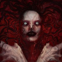 red color which might suggest a bloody or gory environment. The overall impression is one of a vampire or a character from