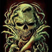 The image depicts a stylized artwork featuring a skeletal figure with an aggressive expression. This figure appears to be surrounded by or emitting tendrils or roots, giving it the appearance of a monstrous being. The use of dark colors and a gothic design style contribute to the horror theme typically associated with such imagery.