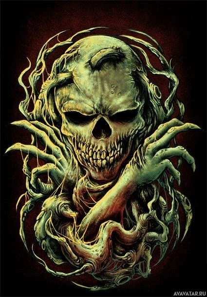 Картинка показывает стилизованное произведение искусства с изображением скелетной фигуры с агрессивным выражением. Эта фигура, кажется, окружена или излучает усики или корни, придавая ей вид чудовищного существа. Использование темных цветов и готического стиля дизайна способствуют теме ужасов, обычно связанной с такими изображениями.