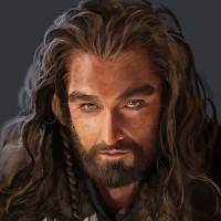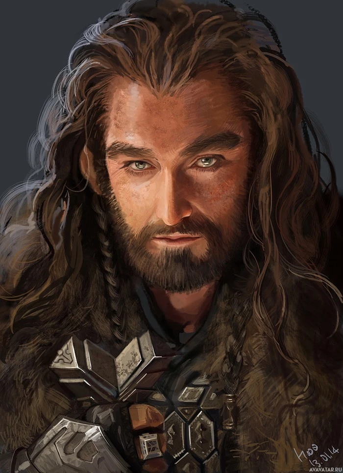 the fictional world of Middle-earth, specifically resembling a dwarf. He has a beard and mustache, and he is wearing armor with intricate details and a helmet that seems to be made of metal. The character also holds what looks like a weapon in his right hand. The artwork has a realistic style with
