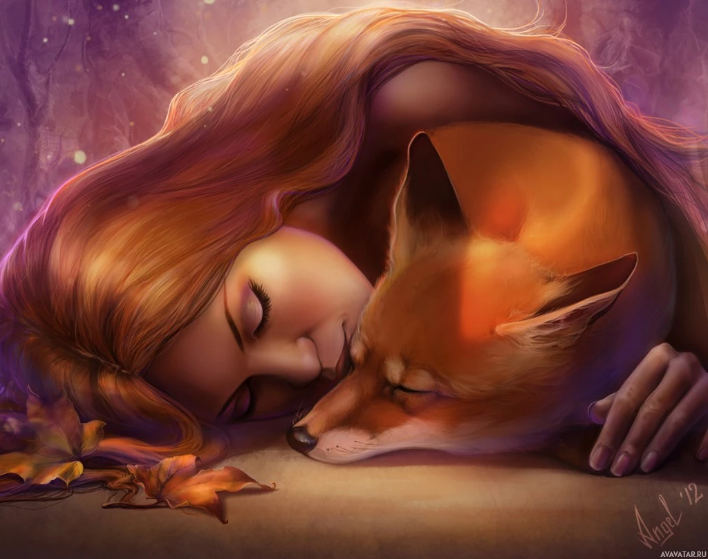 red hair and is lying on what seems to be a soft surface, surrounded by fallen leaves that could suggest it's autumn season. Resting next to her is a fox, also appearing restful with its eyes closed. The scene is set in