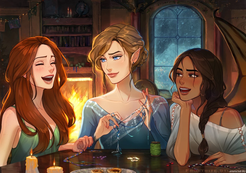 animated characters, likely from a fantasy-themed show or game. They appear to be enjoying a warm gathering indoors. One character is holding what looks like an enchanted card or spell in their hand, suggesting they might be involved in some form of