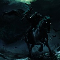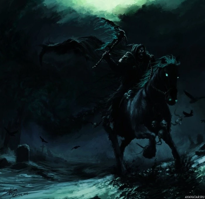 a full moon. The rider is shrouded in darkness with only their face visible, and they are holding a staff that resembles a skull, symbolizing death. Around them, there are several tombstones scattered about, further emphasizing