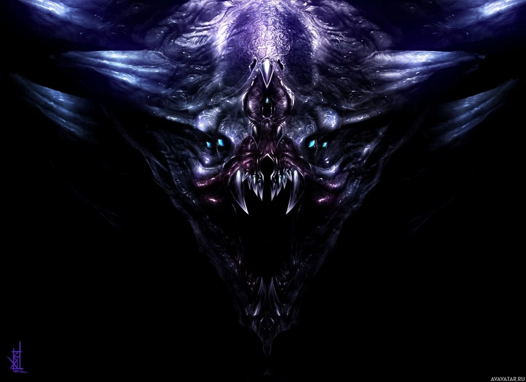 Картинка показывает фантастическое существо с агрессивной внешностью. Он имеет острые зубы и расположен на темном фоне, что предполагает, что это может быть произведение искусства на тему ужасов или монстров. Существо не реально, а скорее творческое создание, возможно, предназначенное для того, чтобы вызвать страх или чувство жуткого.