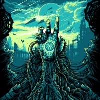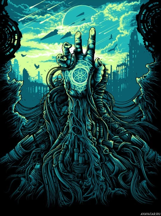 the peace sign. In the background, there is an intricate and dark landscape that appears to be