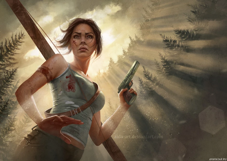 The image depicts a character who appears to be Lara Croft from the Tomb Raider video