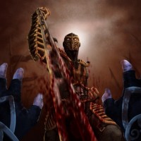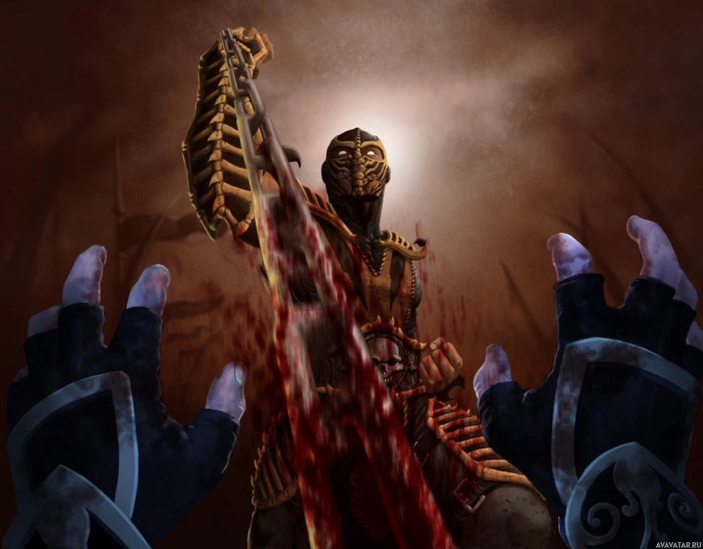 the video game series "Mortal Kombat." Scorpion is depicted with his signature yellow-eyed mask and an iconic chainsaw, which he commonly uses in the games. He is shown in
