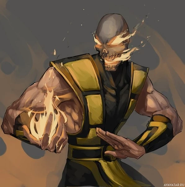 game series. This character is known as Scorpion, recognizable by his skull-like face and flame effects around him. He is depicted in his