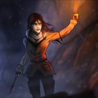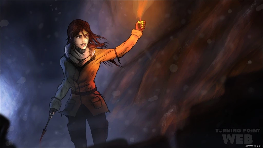 cold weather, such as a scarf around her neck. The overall atmosphere of the picture has a dark and moody tone, which might imply an adventurous or suspenseful scene from