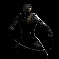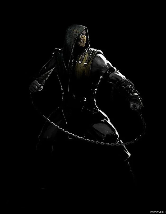 game series. Scorpion is depicted in his signature fighting stance, holding