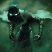 glowing eyes, suggesting a vampire-like appearance. The character stands on a platform surrounded by fog or smoke, which adds to the mysterious and supernatural atmosphere of the image. The overall look and feel of this image aligns well with the themes of mythology, mysticism, and