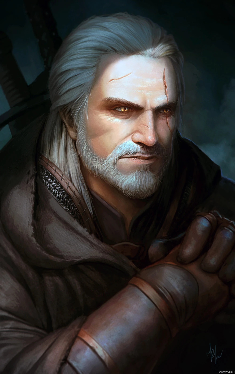the video game "The Witcher." He is depicted with a beard and mustache, wearing armor, and holding what appears to be a medallion in his left hand. Geralt's expression is serious, and he has a scar above his eyebrow. The background suggests an ominous or mysterious setting, fitting for