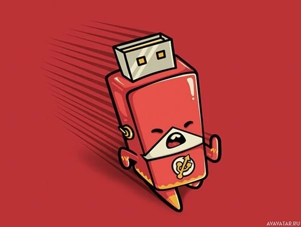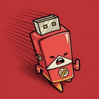 The image depicts an animated USB flash drive character with a stylized, cartoonish appearance. It's designed to look like it's in motion or action, suggesting speed or movement. This character is often associated with the concept of data transfer or storage, particularly for digital files and