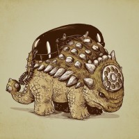 The image depicts an illustration of a stegosaurus with various electronic and technological elements attached to its body. On the back, there's what appears to be a telephone receiver, and on its neck, there are multiple cords or wires that could be interpreted as part of some