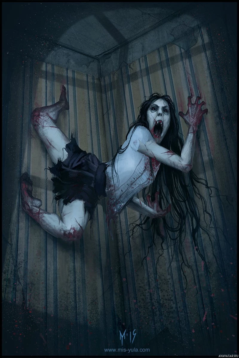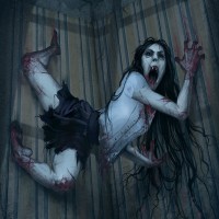 dark hair, and black clothing, lying on the floor in a fetal position. The individual has blood on their hands and appears to be screaming or gasping for breath. They are surrounded by what looks like a wet,
