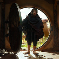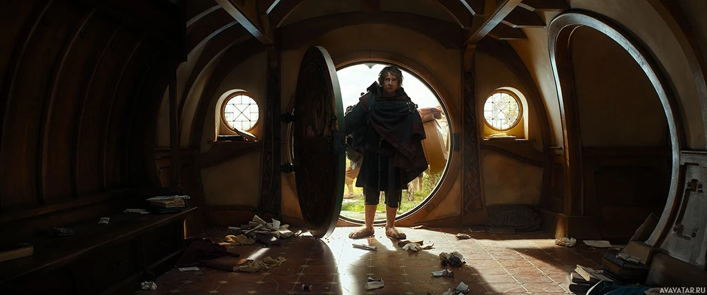 an indoor setting that appears to be a room within a hobbit hole, reminiscent of scenes from the "Middle-earth" series. A person is standing near the entrance, wearing what looks like