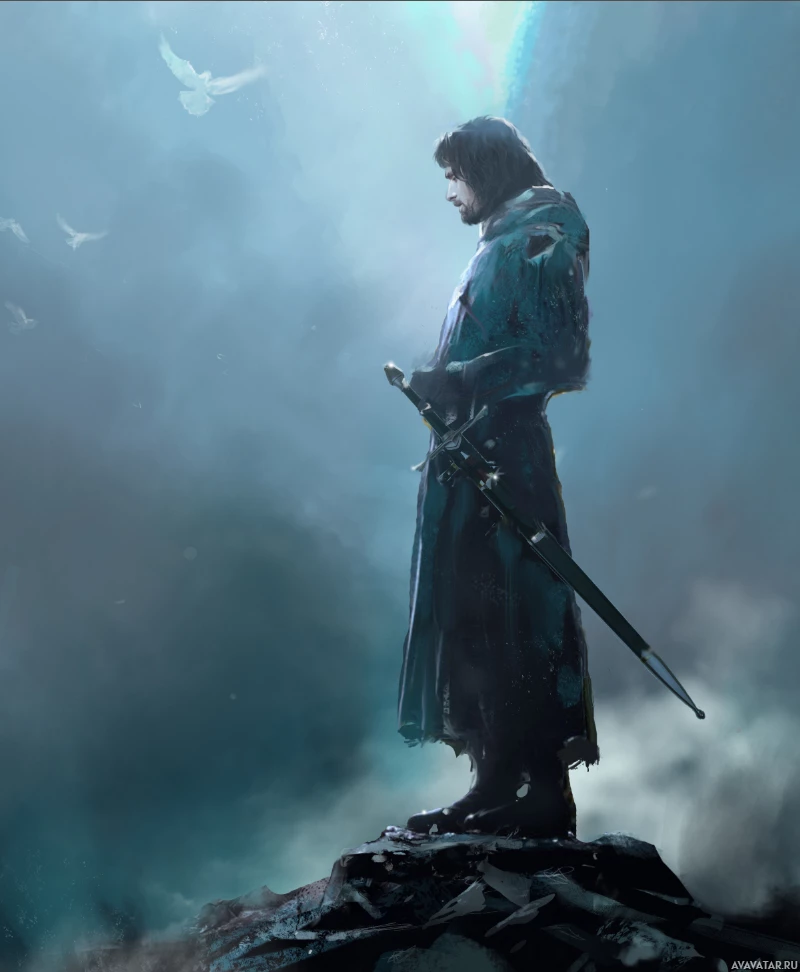 a fantasy story or historical drama. The figure is looking into the distance, which could indicate contemplation, anticipation, or preparation for an encounter. The art style is detailed and evocative, capturing the mood of the scene with a blend of realism and artistic license that enhances the fantasy elements.