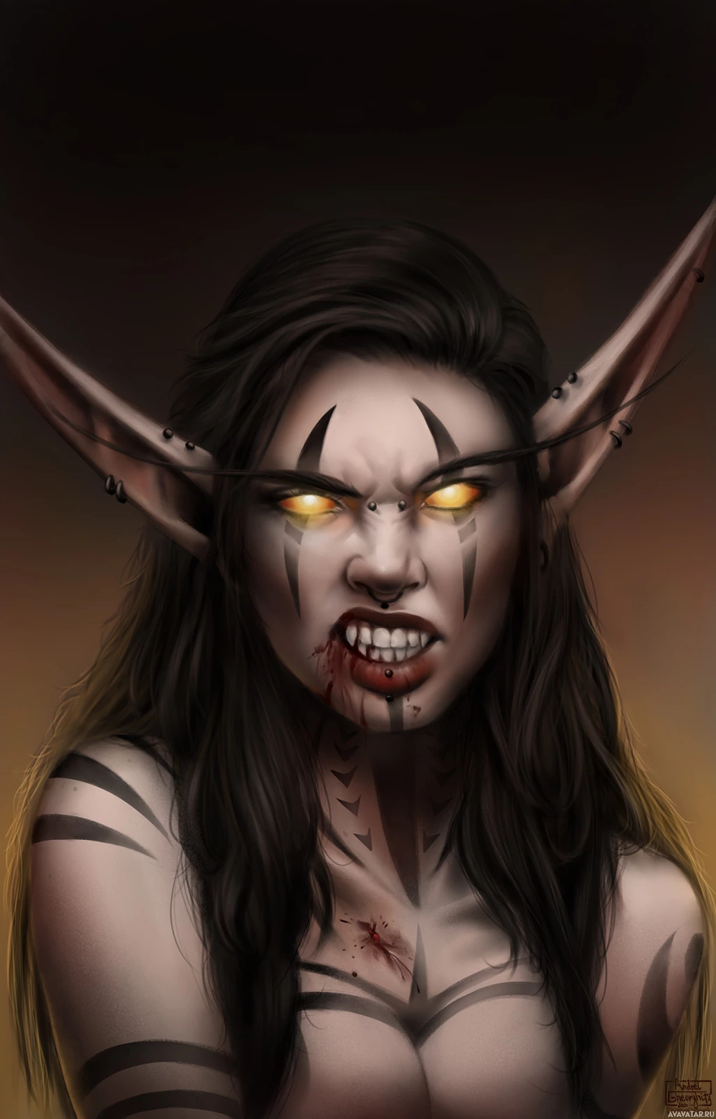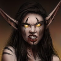 a fantasy setting, possibly a drow. The character has elongated ears and yellow eyes, which are common features in many