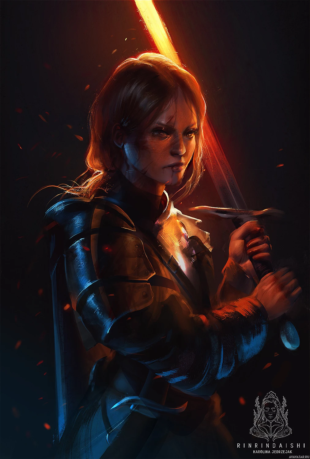 a female character holding a sword in her right hand. She is wearing armor that suggests she might be a warrior or a guardian, and there are signs of battle or struggle around her, indicated by