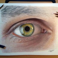a human eye. It appears to be an artistic representation with attention to detail, capturing the complexity of the eye's structure and color variations. There are various