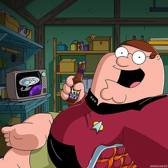 На картинке изображен анимационный персонаж Питер Гриффин из анимационного телесериала «Семейный парень», одетый как офицер Звездного пути. Он сидит на диване, держа в руках пиво, а перед ним экран телевизора с изображением Звездного пути.