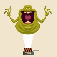 The image shows an animated depiction of a ghost-like creature with exaggerated features such as large, spooky eyes and a wide-