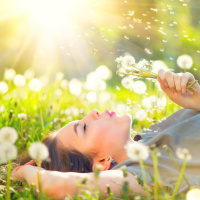 a dandelion close to her face, suggesting she may be blowing it away or simply enjoying its softness. Her expression is serene, and she seems to be experiencing