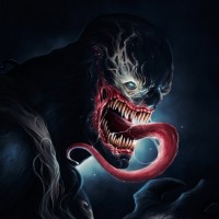 sharp teeth and glowing eyes, which is consistent with Venom's often portrayed as a villainous and aggressive force in the comics.