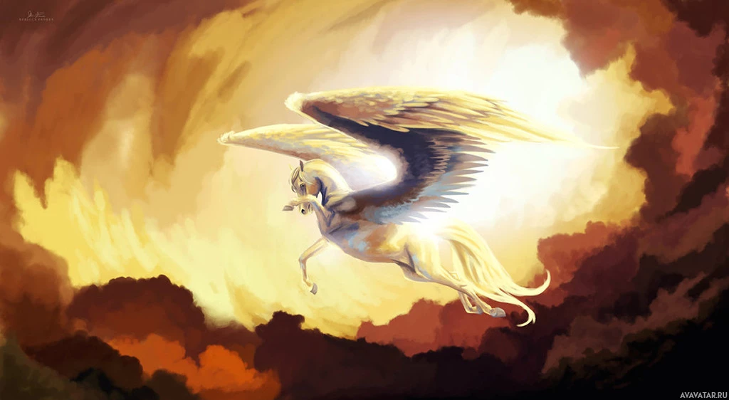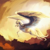 a fantasy scene featuring a pegasus. The pegasus is shown with wings spread wide as if in flight, its body and mane appearing to be of a golden or light-colored hue. Surrounding the pegasus are clouds that suggest it's either descending from above or ascending into