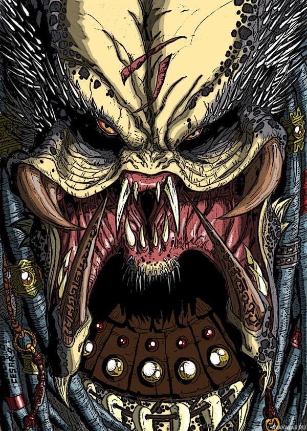 The image shows a stylized, monstrous character that resembles the Predator from
