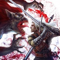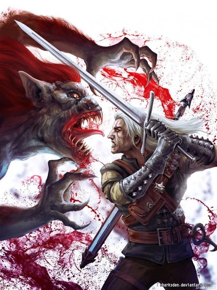 video game series, specifically Geralt. He is shown in battle with a monster that appears to be a werewolf, characterized by its sharp teeth and