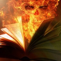 The image features a book with flames coming out of it, and the word "hell" is visible on its pages. In front of the burning book stands