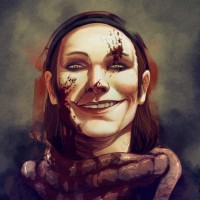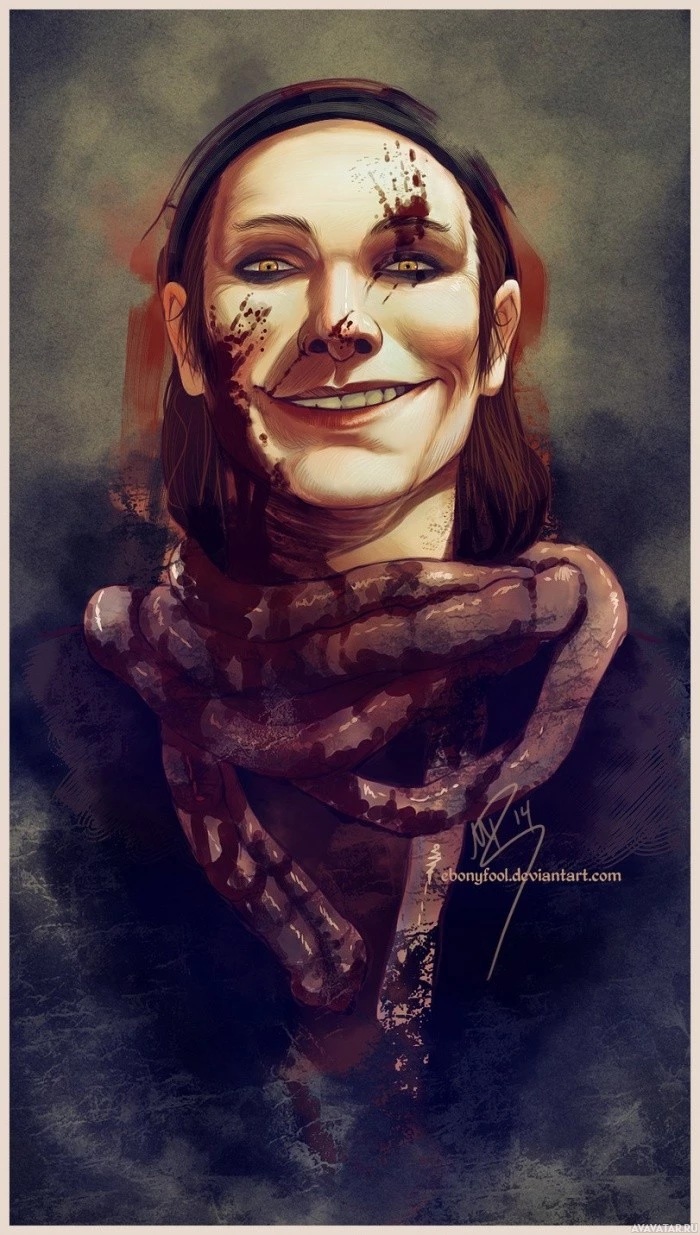 dark skin, pale eyes, and a blood-stained smile. They are set against