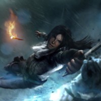 an action pose, seemingly jumping or falling from a high ledge with rocks below and a stormy sky above. It looks like she might have been engaged in a battle or