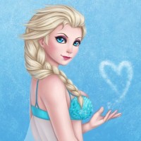 the animated movie "Frozen." She is depicted in a stylized manner and is wearing lingerie with stockings. Elsa is known for her long blonde braid and has