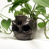 На картинке изображен плантатор в форме черепа, содержащий пышные зеленые растения. Растение яркое, с несколькими листьями, которые, кажется, процветают в контейнере. Плантатор черепа расположен на поверхности, которая может быть столешницей или столом.