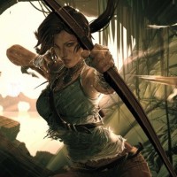 a gaming character named Lara Croft. The setting appears to be a lush green forest or jungle, and there are