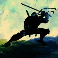 На картинке изображен силуэт человека в стиле черепах-ниндзя-подростков, персонаж изображен как Леонардо. Искусство имеет импрессионистическое чувство, используя оттенки синего и зеленого, которые придают ему динамичную атмосферу.