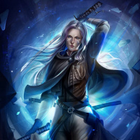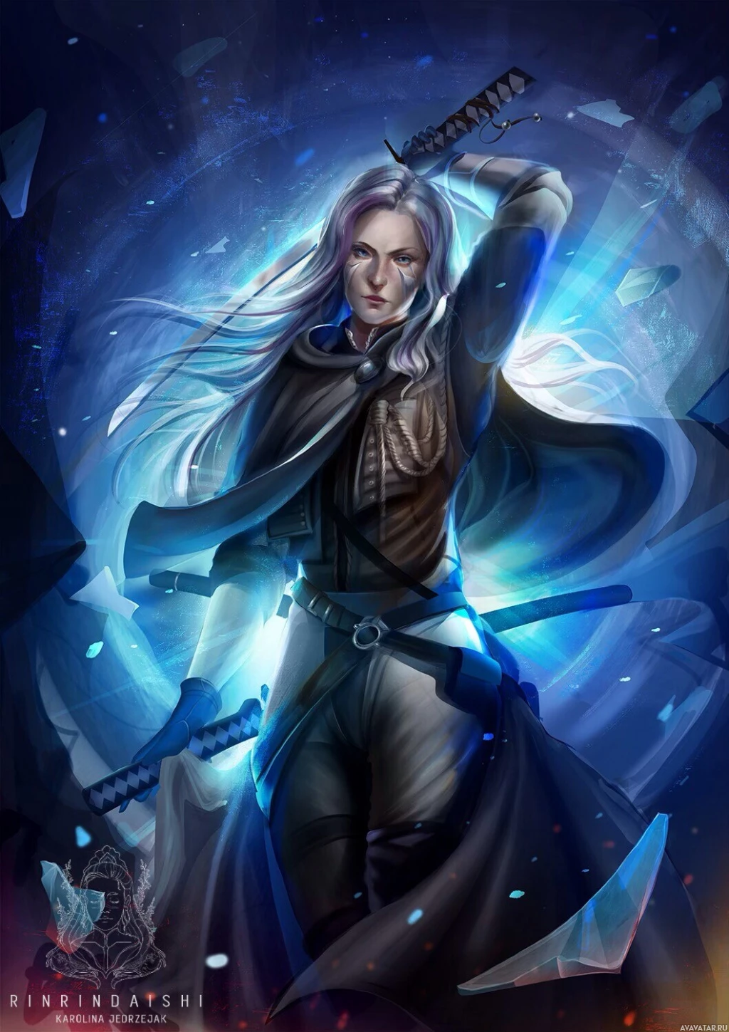 a dynamic feel with blue and black tones, suggesting movement or energy around her. There are additional elements like