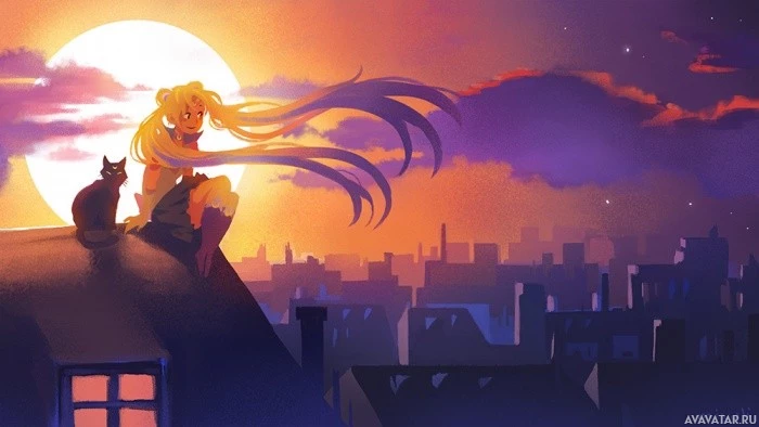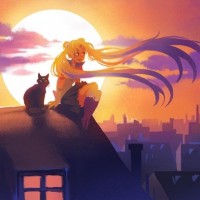 Sailor Moon sitting on the roof of a building. She has