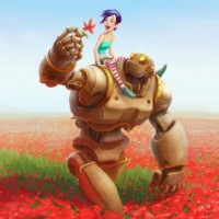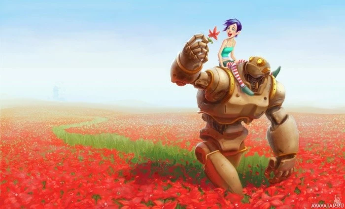 blonde hair, riding on the shoulders of a robot. They are standing in