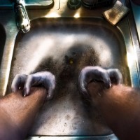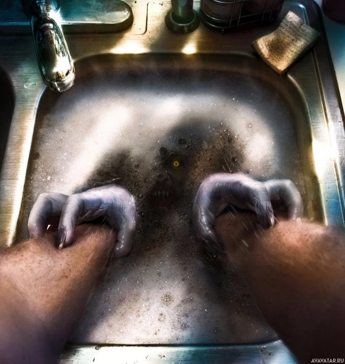 the hands in the sink. The image has a horror-like quality due to the context provided, although it could also just be an unusual and mundane scene depending on the viewer's perspective.