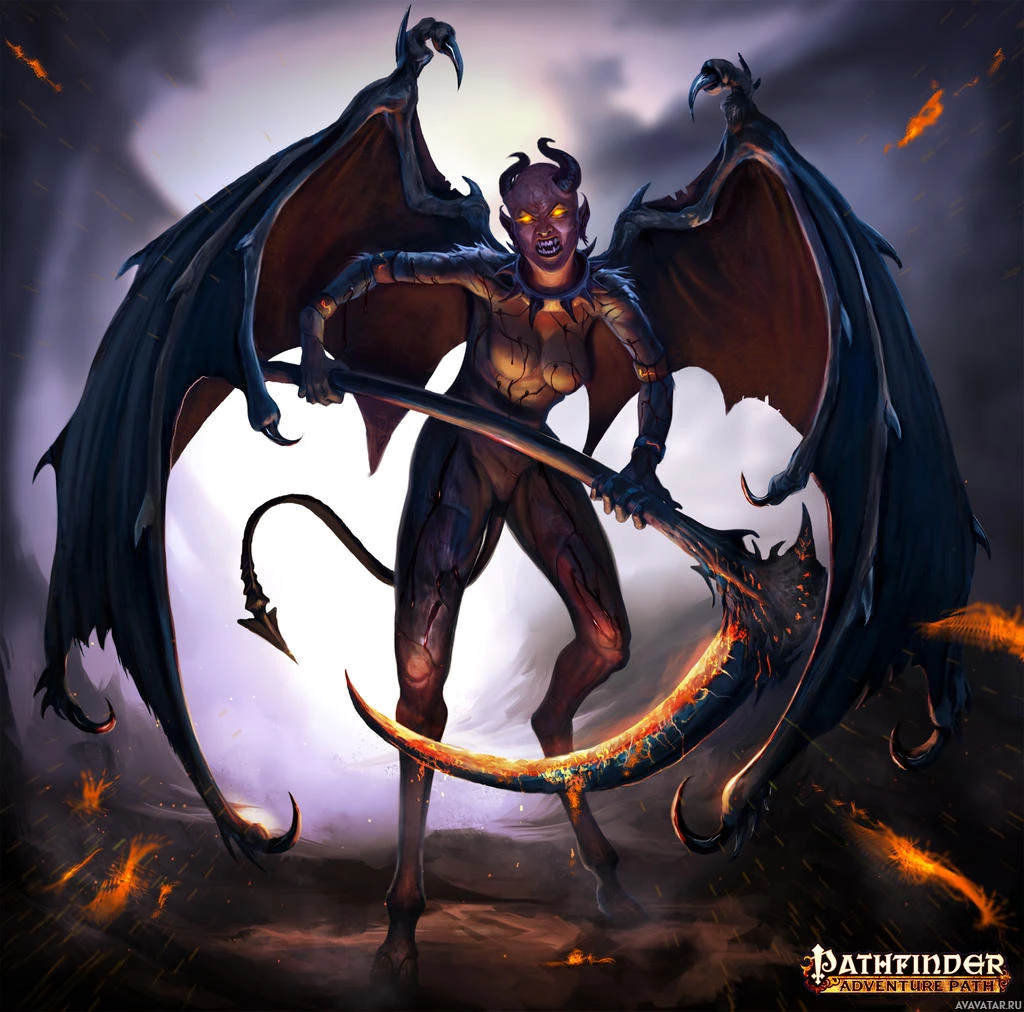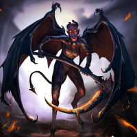 a fantasy scene featuring a character that appears to be a demon or devil. This creature has large wings and is holding a staff with flames at the top, suggesting it might have some