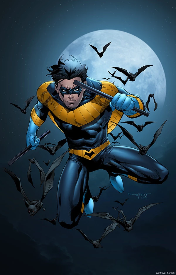book character known as the Nightwing. He is depicted in flight against a backdrop that includes bats flying near