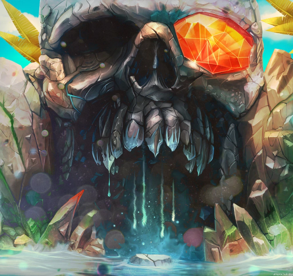 a cave environment that is often depicted in fantasy or adventure themes. The overall scene has a mystical or ominous feel due to the skull's