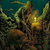 This is an illustration of a dark, supernatural or horror-themed scene. There are several elements that are commonly associated with such themes: 1. The central figure appears to be a ghoul or undead creature, characterized by its pale complexion and